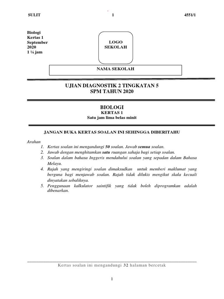 Ujian Diagnostik 2 Tingkatan 5 Spm Tahun 2020 Biologi Kertas 1 September 2020 1 Jam Logo Sekolah Pdf www.scribd.com