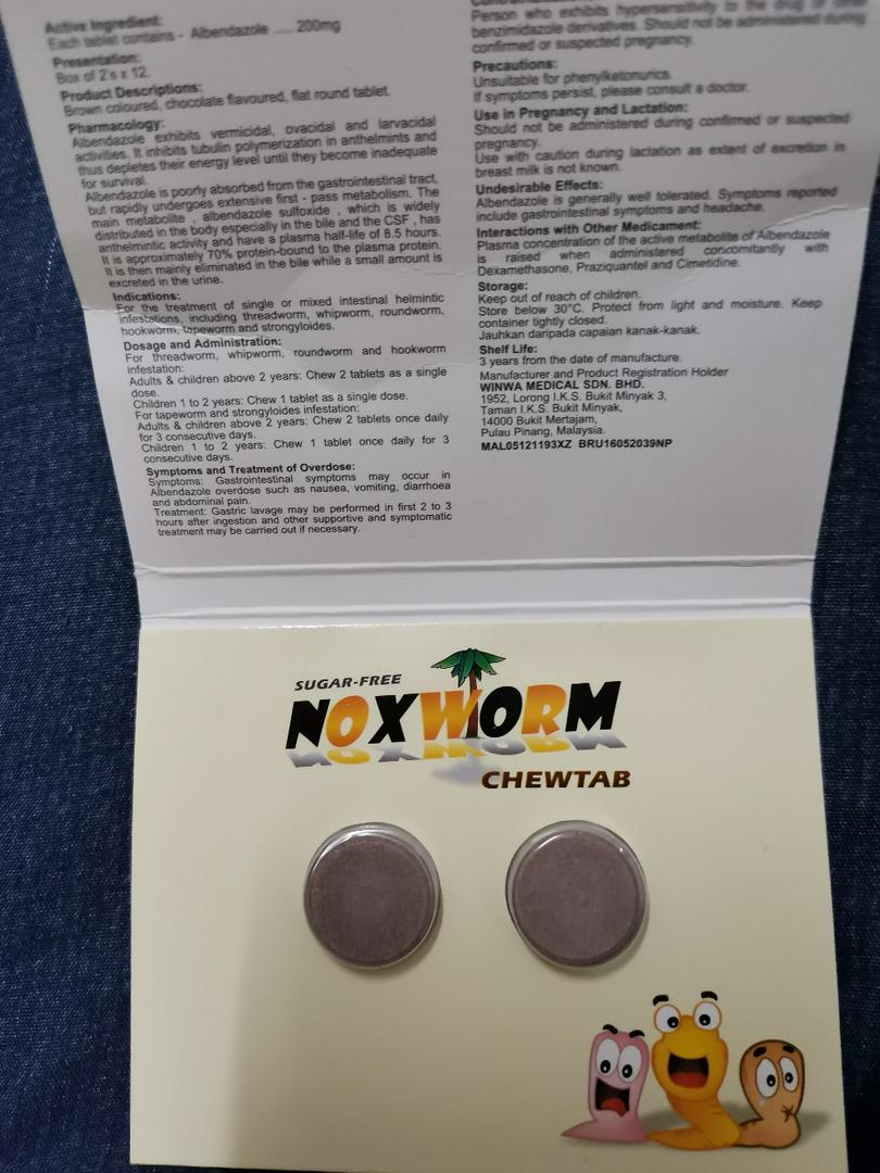 Ubat Cacing Coklat. Biasa bdk 1 1/2 tahun nurse dah bg makan ubat cacing n lps tu tiap2 tahun kena . Usia 1 tahun hingga dewasa ☝ mempunyai pelbagai perisa seperti coklat , pisang . Contact should be treated at the same time in order to prevent reinfestation. Sy beli sendiri ubat cacing d farmasi jenis tablet perisa coklat .