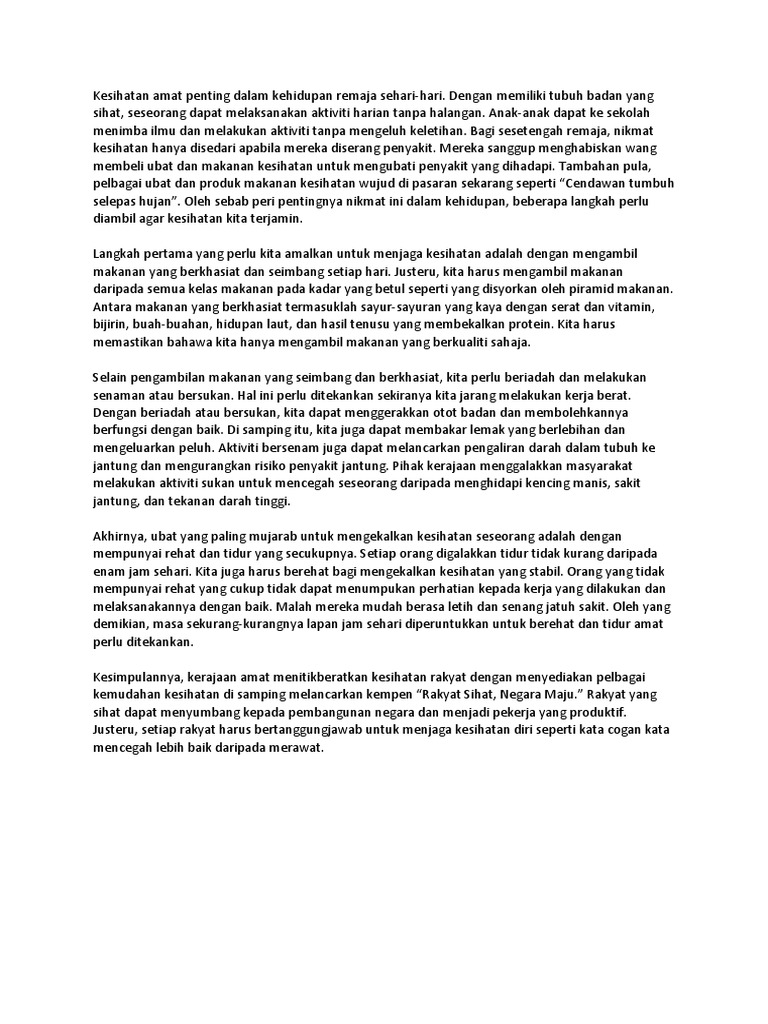 Karangan Isu Kesihatan. Keadilan membantu badan menjadi kuat dan fleksibel. Kesihatan remaja yang mengamalkan semua amalan ini pasti baik kerana bukan sahaja tubuh mereka sihat tetapi emosi serta pemikiran mereka turut menerima impak positifnya. Contoh karangan amalan gaya hidup sihat. Masalah kesihatan semakin serius semasa manusia mengejar kemajuan dan kekayaan.